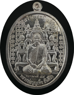 ๕. เหรียญเนื้อเงิน ด้านหน้ามีหมายเลข ๙ ตรงสังฆาฏิ (อุ้มเลข ๙) ส่วนด้านหลังซ้ายบนตอกโค้ดดอกบัวชื่อ และฉายา ด้านขวาบนเป็นหมายเลขชุด ๑- ๒๐