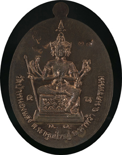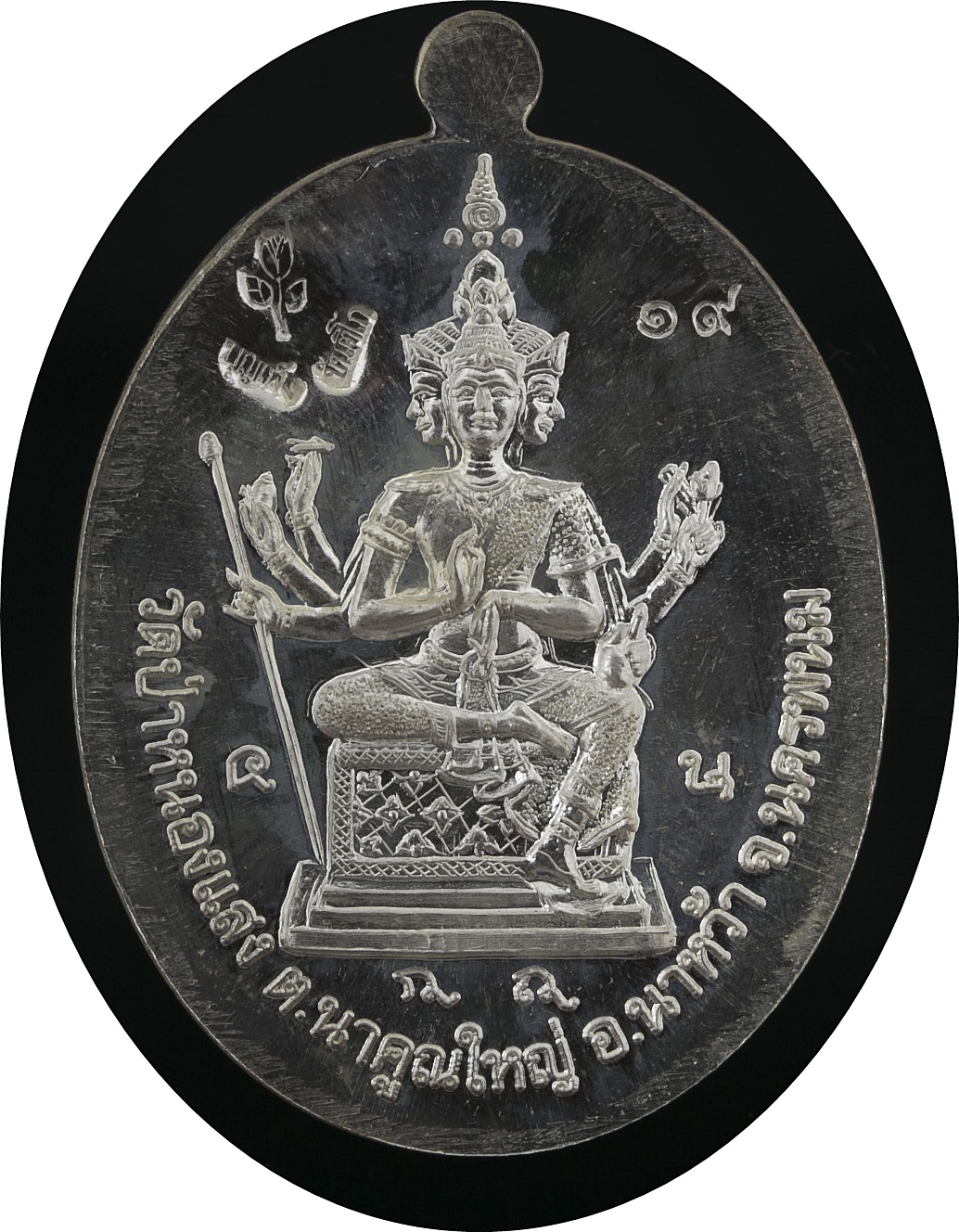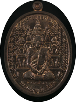 ๖. เหรียญเนื้อนวโลหะ ด้านหน้ามีหมายเลข ๙ ตรงสังฆาฏิ (อุ้มเลข ๙) ส่วนด้านหลัง ซ้ายบนตอกโค้ดดอกบัวชื่อและฉายา ด้านขวาบนเป็นหมายเลขชุด ๑- ๒๐