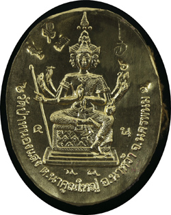 ๑๒. ล็อกเก็ตหลังท้าวมหาพรหมเนื้อทองคำ มีจำนวน ๖ อัน ( หมายเลข ๑ – ๖ ) ด้านหน้า ฉากทอง ด้านหลังท้าวมหาพรหมเนื้อทองคำ บนซ้ายโค้ดดอกบัว ชื่อและฉายา ด้านบนขวาเป็นลายมือจารของหลวงพ่อ ถัดลงมาเป็นหมายเลขกำกับ ตอกเลข ๙ ด้านหน้าชื่อวัดและด้านหลัง