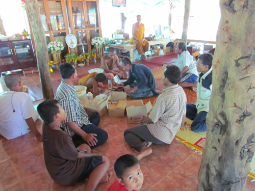 ผู้จัดสร้างพร้อมด้วยญาติโยม ร่วมกันปิดแผ่นหลังล็อกเก็ต ซึ่งเป็นมวลสาร ๑๐๘ ชนิด เส้นเกศา และผ้าจีวรของหลวงพ่อบุญเพ็ง ขันติโก ปิดทับด้วยแผ่นโลหะรูปท้าวมหาพรหม